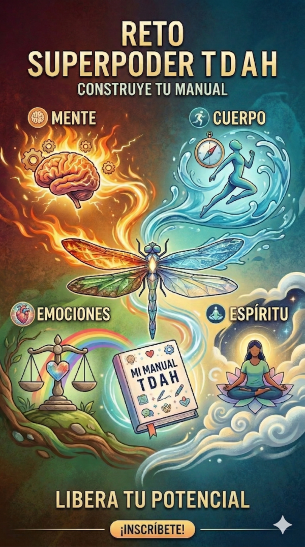 Únete al Reto Superpoder TDAH y deja de sobrevivir para empezar a prosperar. En este viaje intensivo y holístico, equilibrarás tu Mente, Cuerpo, Emociones y Espíritu para desbloquear el verdadero potencial de tu neurodivergencia.