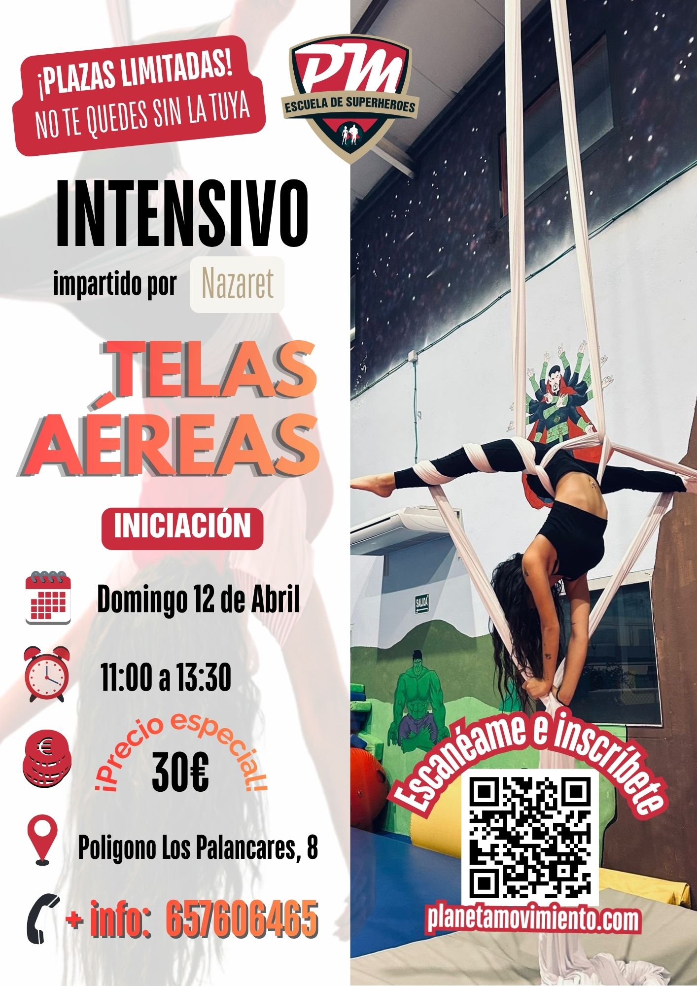 Taller intensivo de telas aéreas en Cuenca nivel iniciación en Planeta Movimiento. Aprende bases, técnicas y figuras desde cero en una sesión práctica el domingo 12 de abril de 11:00 a 13:30.